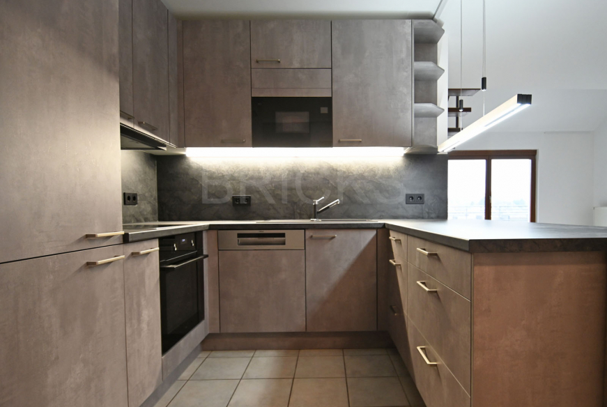 - au niveau inférieur : un grand living avec de grandes baies vitrées, une chambre avec accès à une grande terrasse (14m2 – orientation ouest-nord), une cuisine ouverte entièrement équipée, une salle de douche avec lavabo et WC, une deuxième terrasse de 16m2 (plein sud) avec marquise électrique télécommandée, accessible depuis le living;