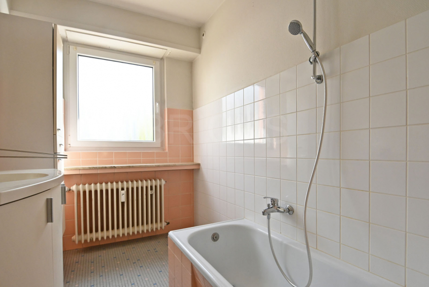 Châssis de fenêtre en PVC avec double vitrage, chauffage au gaz. L’appartement doit être entièrement rénové.