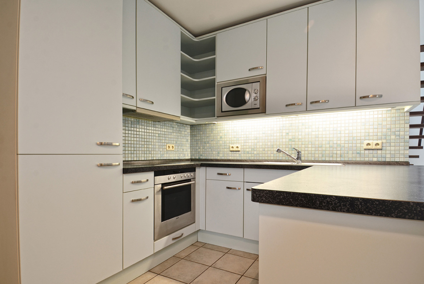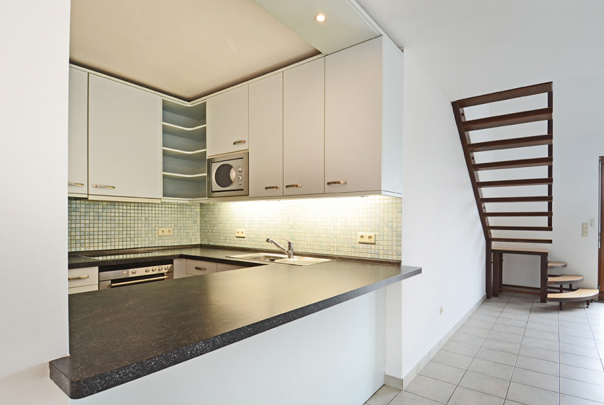 - au niveau inférieur : un grand living avec de grandes baies vitrées, une chambre avec accès à une grande terrasse (14m2 – orientation ouest-nord), une cuisine ouverte entièrement équipée, une salle de douche avec lavabo et WC, une deuxième terrasse de 16m2 (plein sud) avec marquise électrique télécommandée, accessible depuis le living;