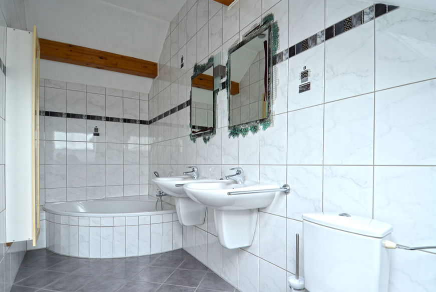 - au niveau supérieur : une grande chambre ouverte avec sa salle de bains en-suite avec baignoire surdimensionnée, 2 lavabos et WC.
