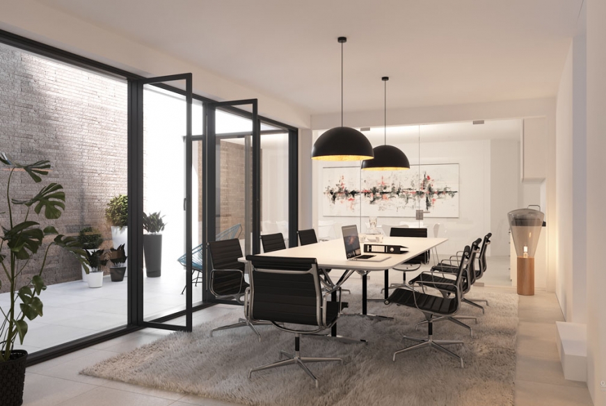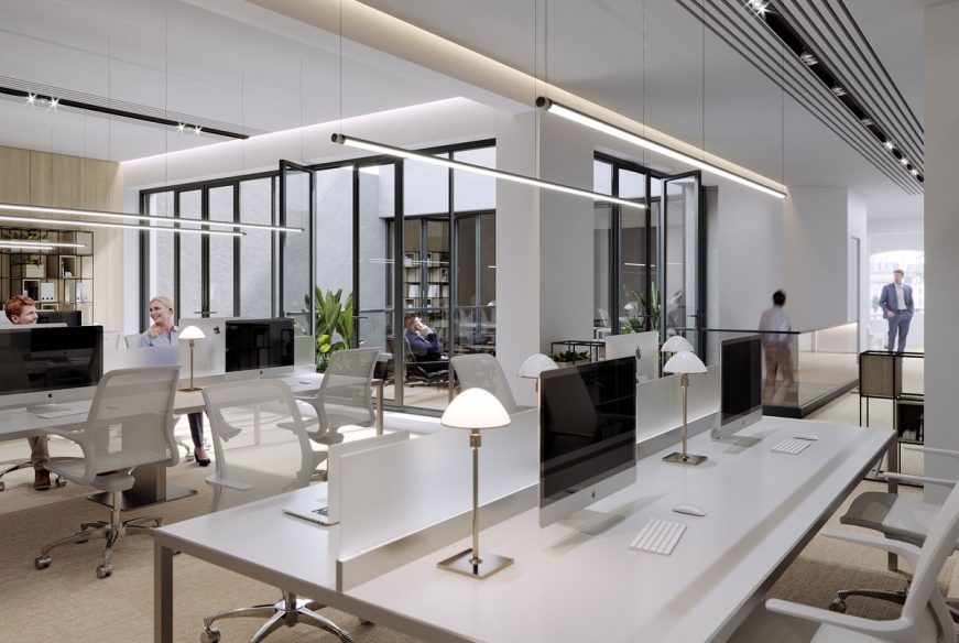 Le bureau dispose d’une surface intérieure de 366,27m2 et d’une cour intérieure de 18,60m2.
