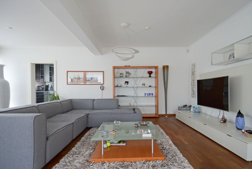 Finitions et matériaux : L’appartement dispose d’une porte de sécurité ; d’un parlophone ; de fenêtres avec double-vitrage et châssis en PVC ; de volets extérieurs et stores sur les fenêtres de toit ; d’un parquet dans les pièces à vivre et les chambres, d’un carrelage pour la cuisine et les sanitaires.