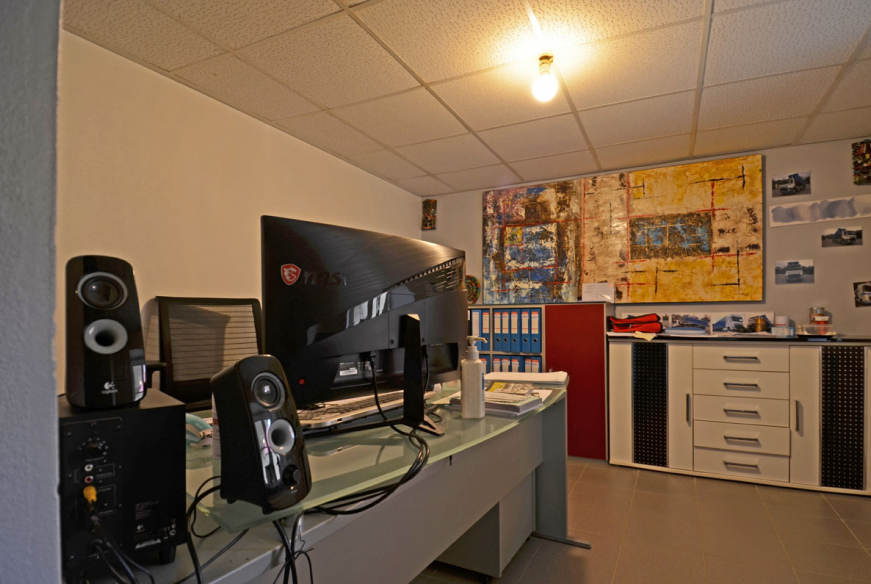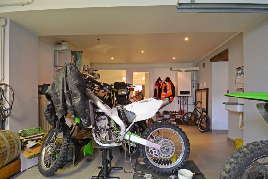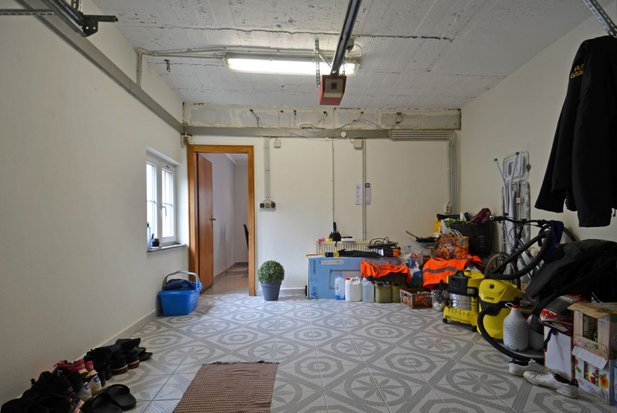 Bureau, garage une voiture avec porte électrique et point d’eau, espace de stockage / buanderie, salle de douche avec WC.