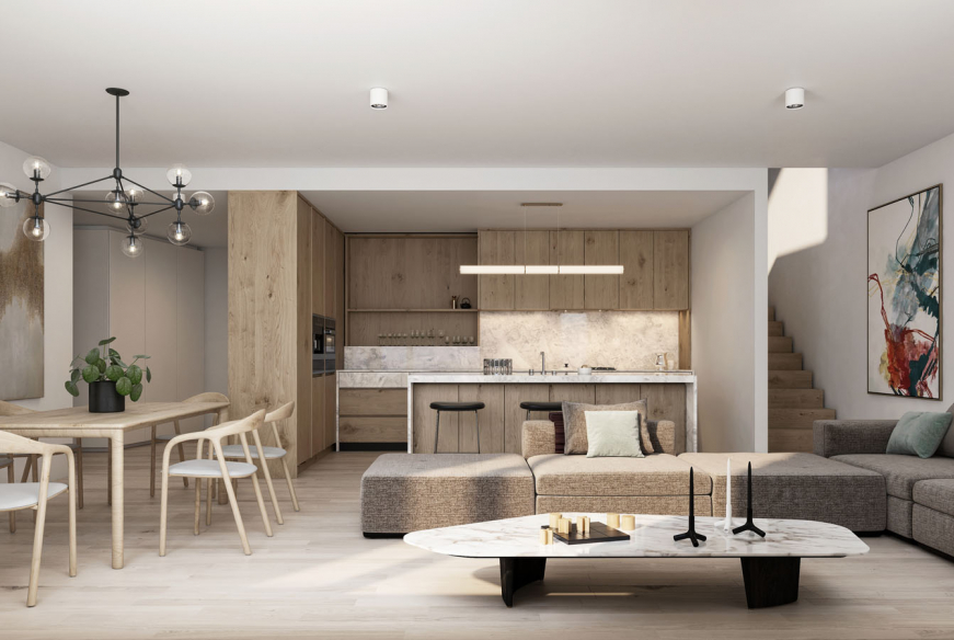 Cet appartement-duplex d’une surface pondérée de 113,31 m2 (surface utile intérieure de 103,97 m2) est situé au 2ème et 3ème étage de la résidence 6.1. Il se compose comme suit au deuxième étage : une grande entrée, un WC séparé, une grande pièce à vivre avec une cuisine ouverte, un débarras et une chambre à coucher avec une salle de bain attenante. Un escalier menant au 3ème étage dont on retrouvera une deuxième chambre à coucher avec un accès à la terrasse et une salle de bains attenante à la chambre.