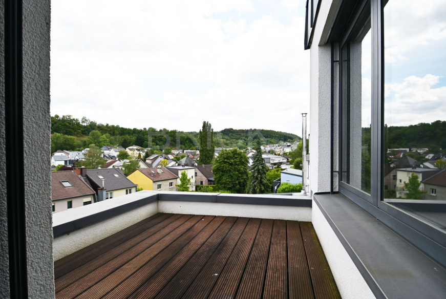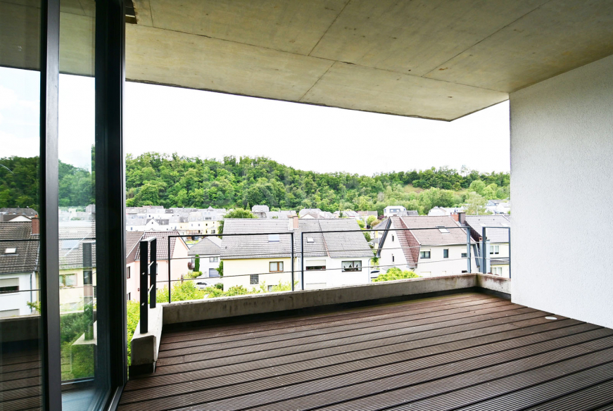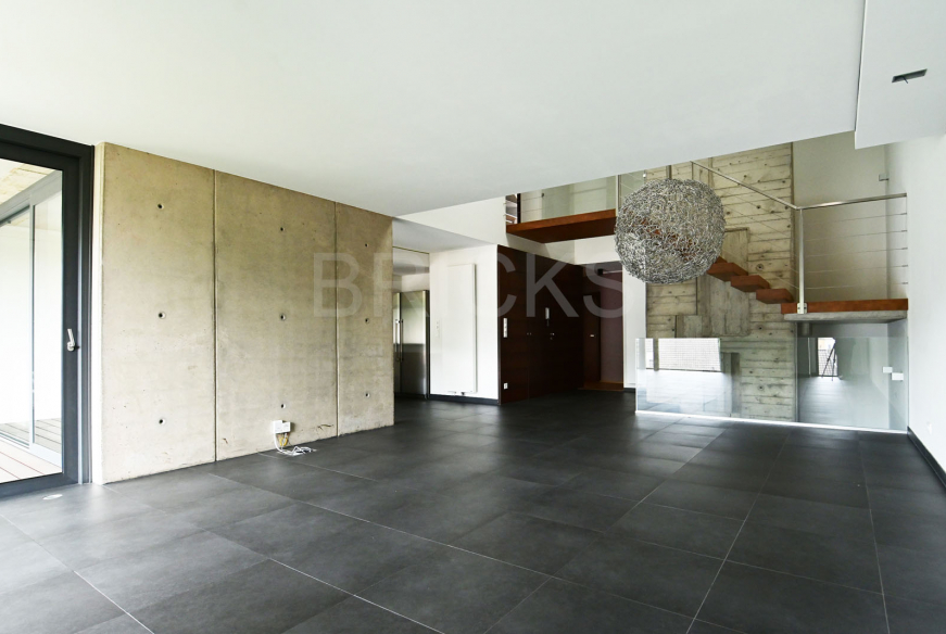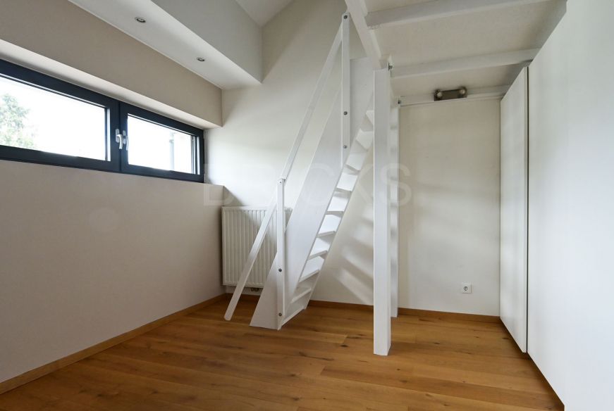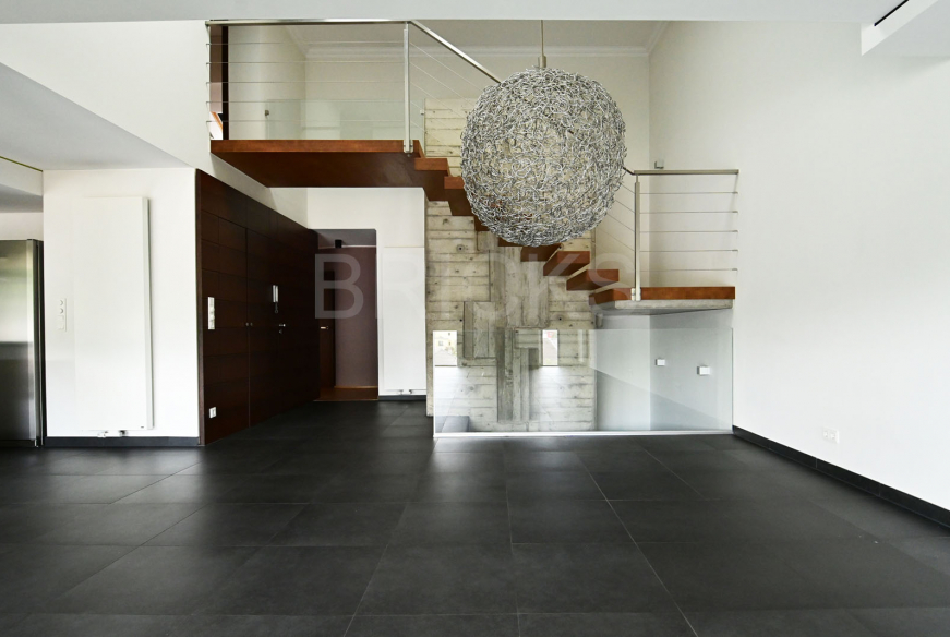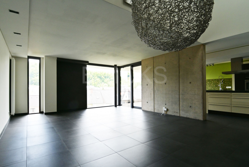 Très grand living avec coin déjeuner, préparation pour feu ouvert. De grandes baies vitrées (châssis en aluminium de qualité) donnent sur une très belle loggia de 13 m2 (revêtement au sol en bois Bankirai sur plots) orientée plein sud et offrant de belles vues dégagées sur le voisinage.
