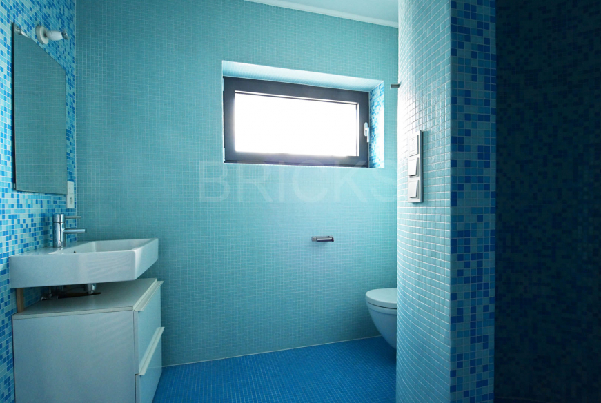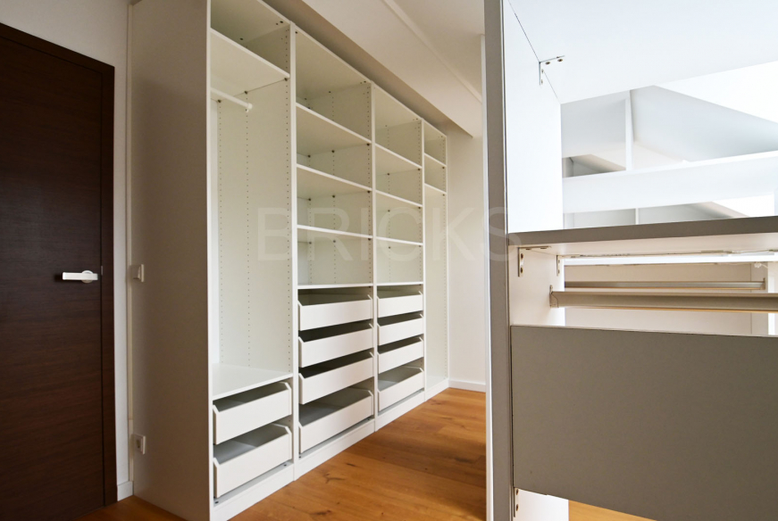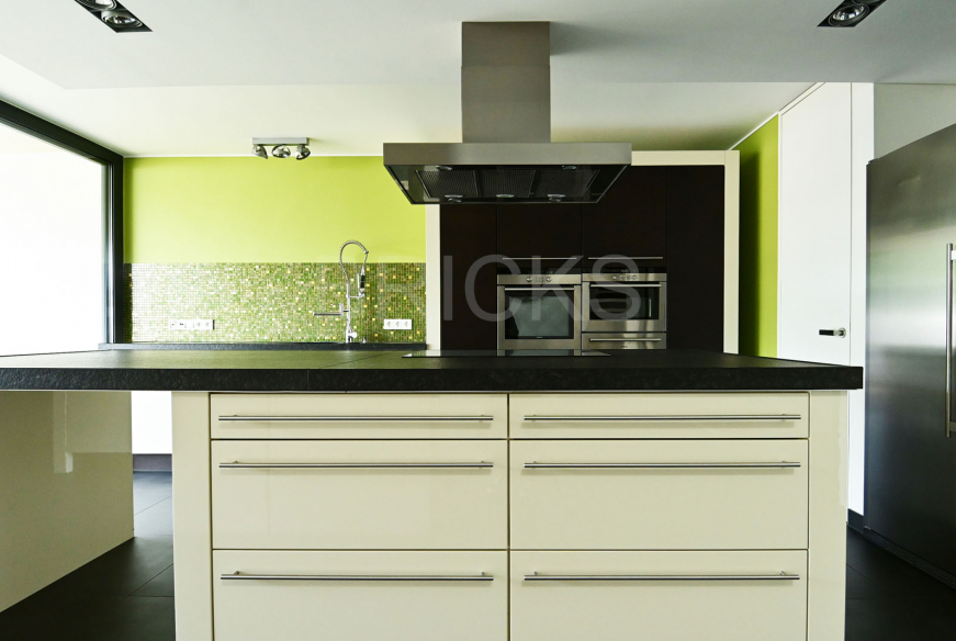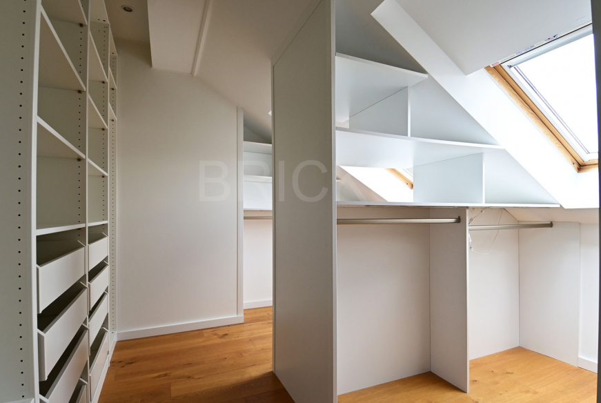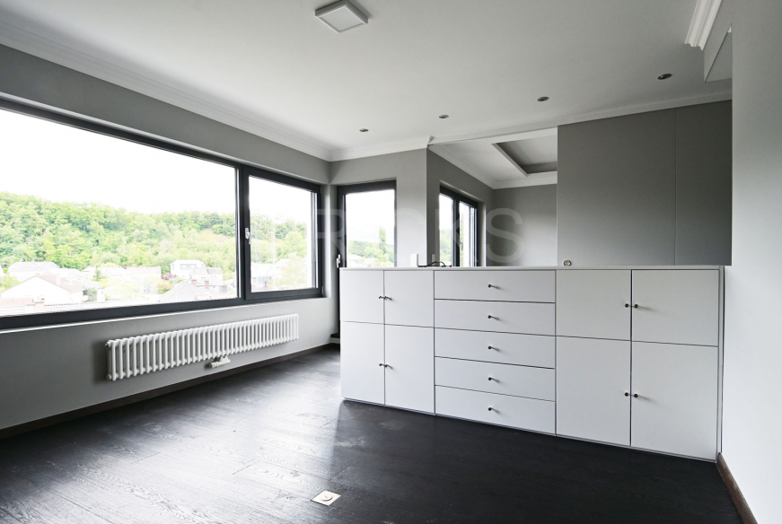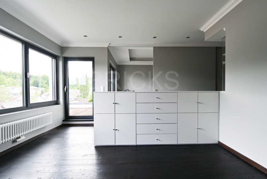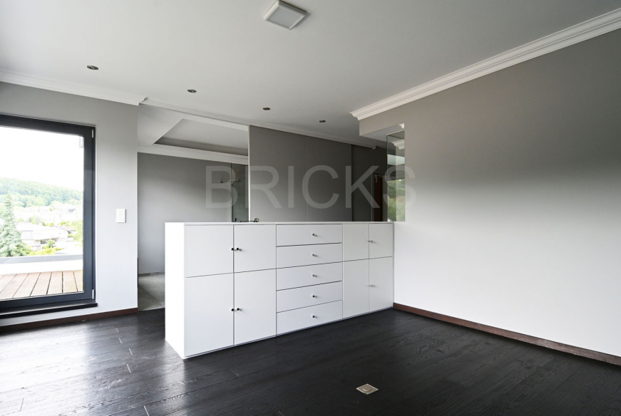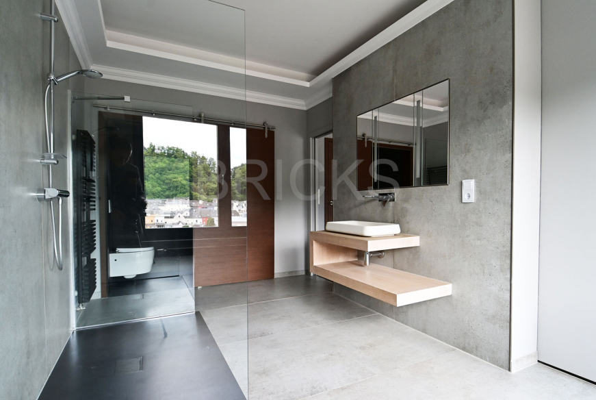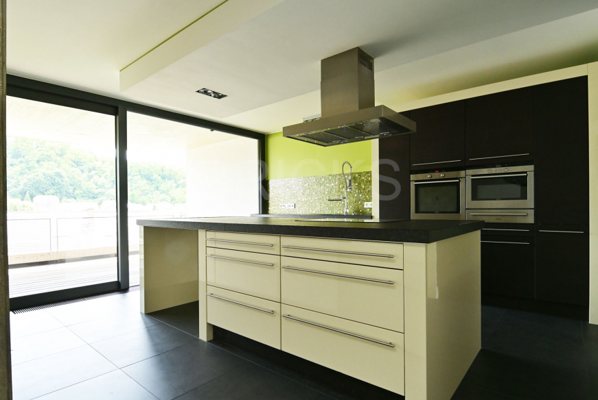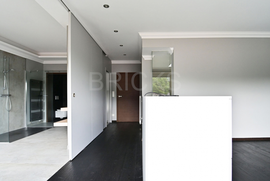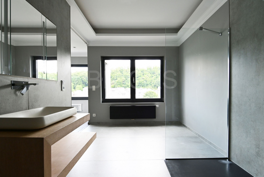 La cuisine moderne est hyper équipée et on cherchera en vain des équipements manquants. Surface de travail en granite flammé, four et micro-ondes Siemens haut de gamme, plaques over-size à induction, chauffe-plats, magnifique frigo Liebherr, multiples solutions de rangement intégré, accès direct à la loggia. Revêtements de sol en grès cérame Cronos avec spots au sol intégrés, faux plafonds avec spots design haut de gamme intégrés, joints creux.