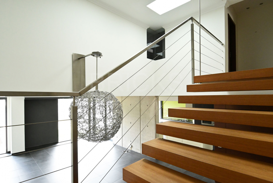 Un escalier flottant en hêtre massif dessiné sur mesure relie les deux niveaux.