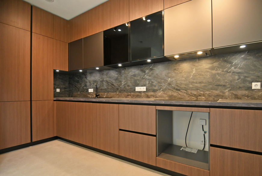 Hall d’entrée avec un placard sur mesure, une magnifique cuisine ouverte et entièrement équipée (four, grand réfrigérateur, congélateur, lave-vaisselle, hotte avec filtre à charbon, plaque de cuisson 4 feux à induction et de nombreux rangements), une pièce de vie lumineuse équipée de deus canapés en cuir, d’un placard sur mesure, d’une meuble TV et donnant accès à la belle terrasse de 11,25 m2 ainsi qu’au vaste jardin de 85,31 m2. L’appartement dispose d’un WC séparé, d’une belle chambre à coucher équipée d’un lit et d’une salle de bains attenante comprenant, un meuble avec deux lavabos, un radiateur sèche-serviette et une douche.